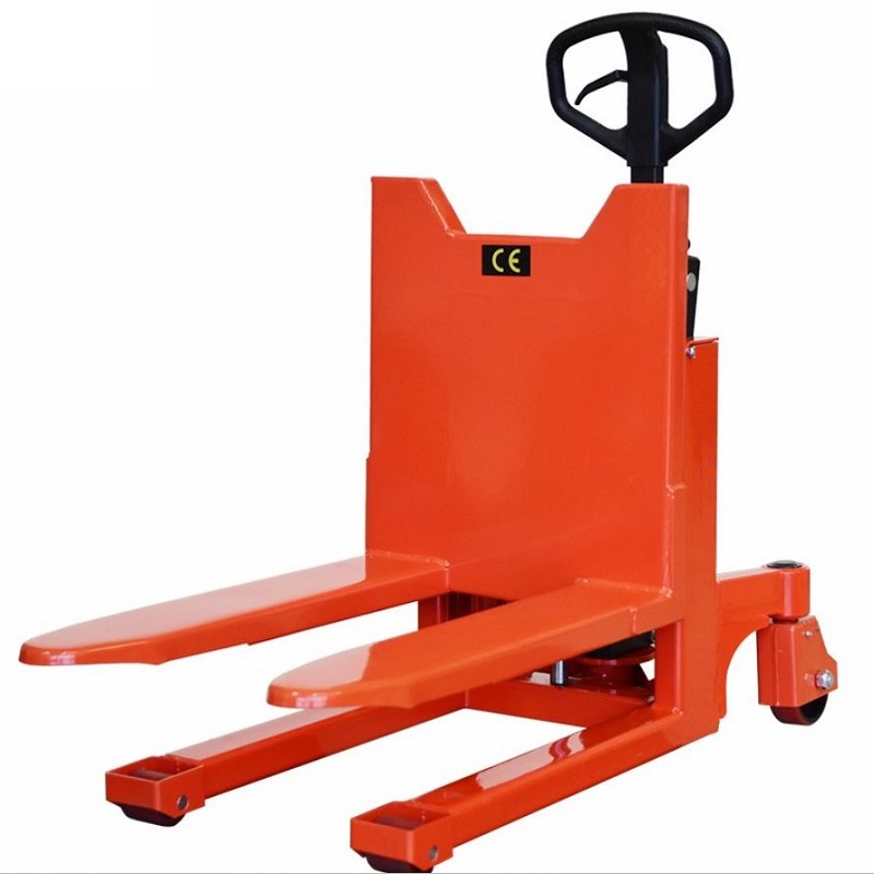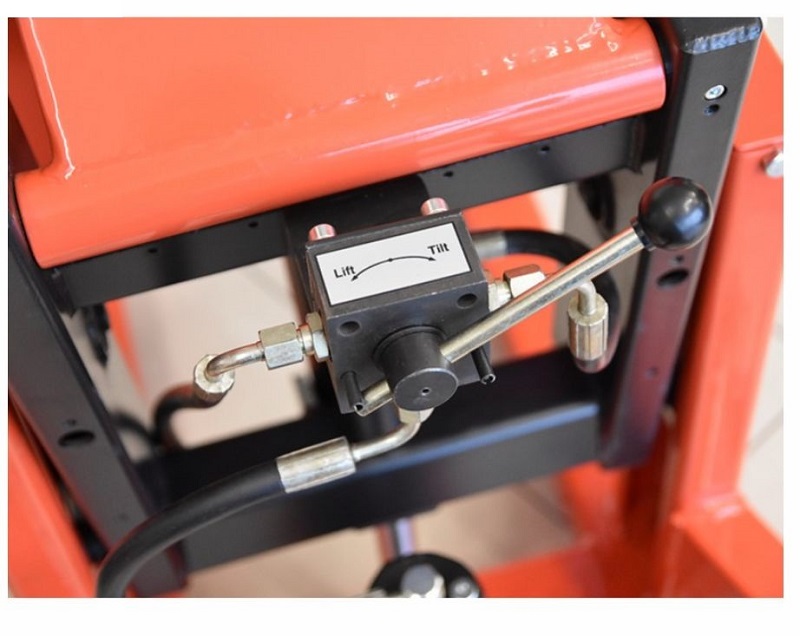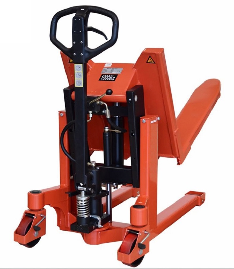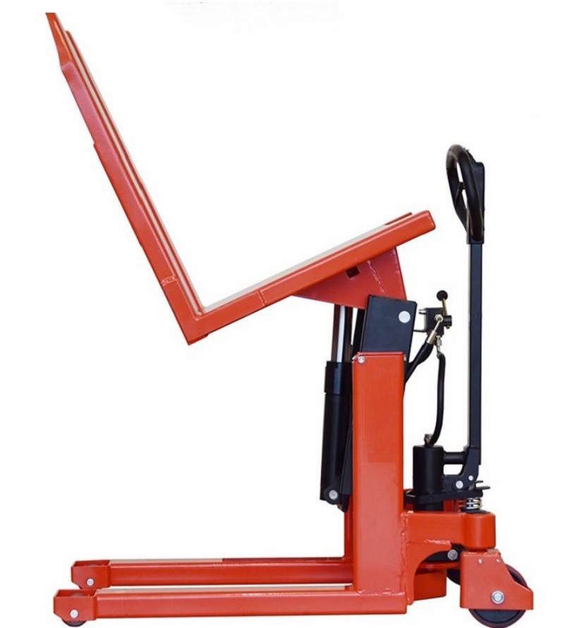 Χειροκίνητο παλετοφόρο ειδικής κατασκευής με ανατροπή. Μπορει να ανυψώσει φορτίο 1000kg μέχρι τα 30cm και έπειτα να το περιστρέψει σχεδόν 90 μοίρες.