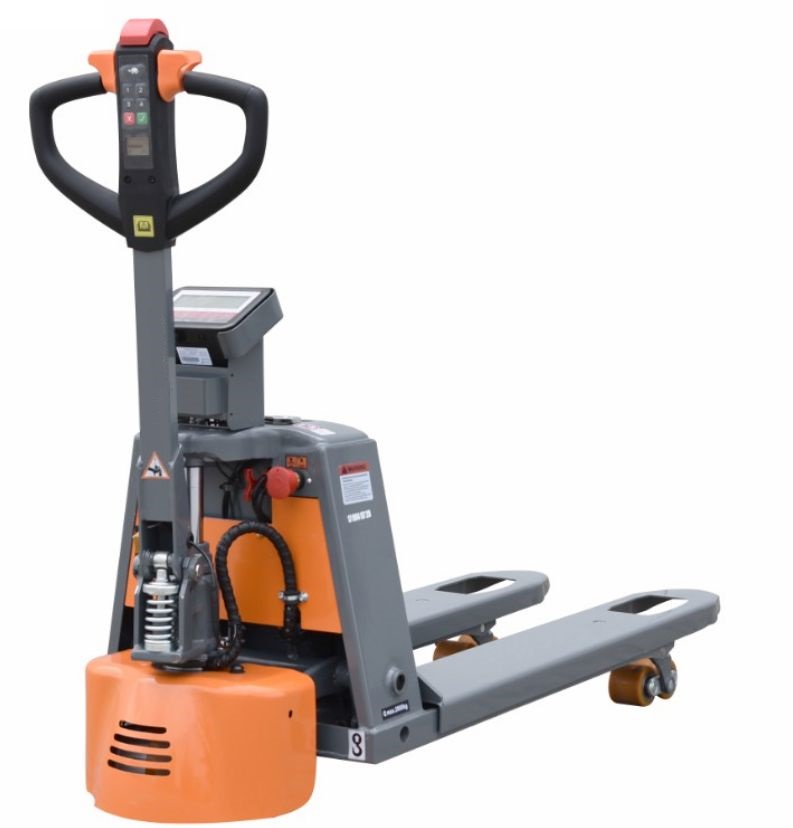 Παλετοφόρο πλήρως ηλεκτρικό σε κίνηση, ανύψωση και κάθοδο με ενσωματωμένο σύστημα ζύγισης 2000 κιλών.